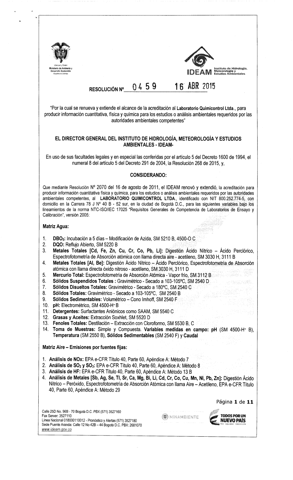 Laboratorios acreditados por el Instituto de Hidrología, Meteorología y Estudios Ambientales, IDEAM, bajo los lineamientos de la norma NTC-ISO/IEC 17025 ¿Requisitos Generales de Competencia de Laboratorios de Ensayo y Calibración¿, y según lo estipulado en el Decreto 1076 de 2015, ¿Decreto Único Reglamentario del Sector Ambiente y Desarrollo Sostenibles¿ artículo 2.2.8.9.1.7.