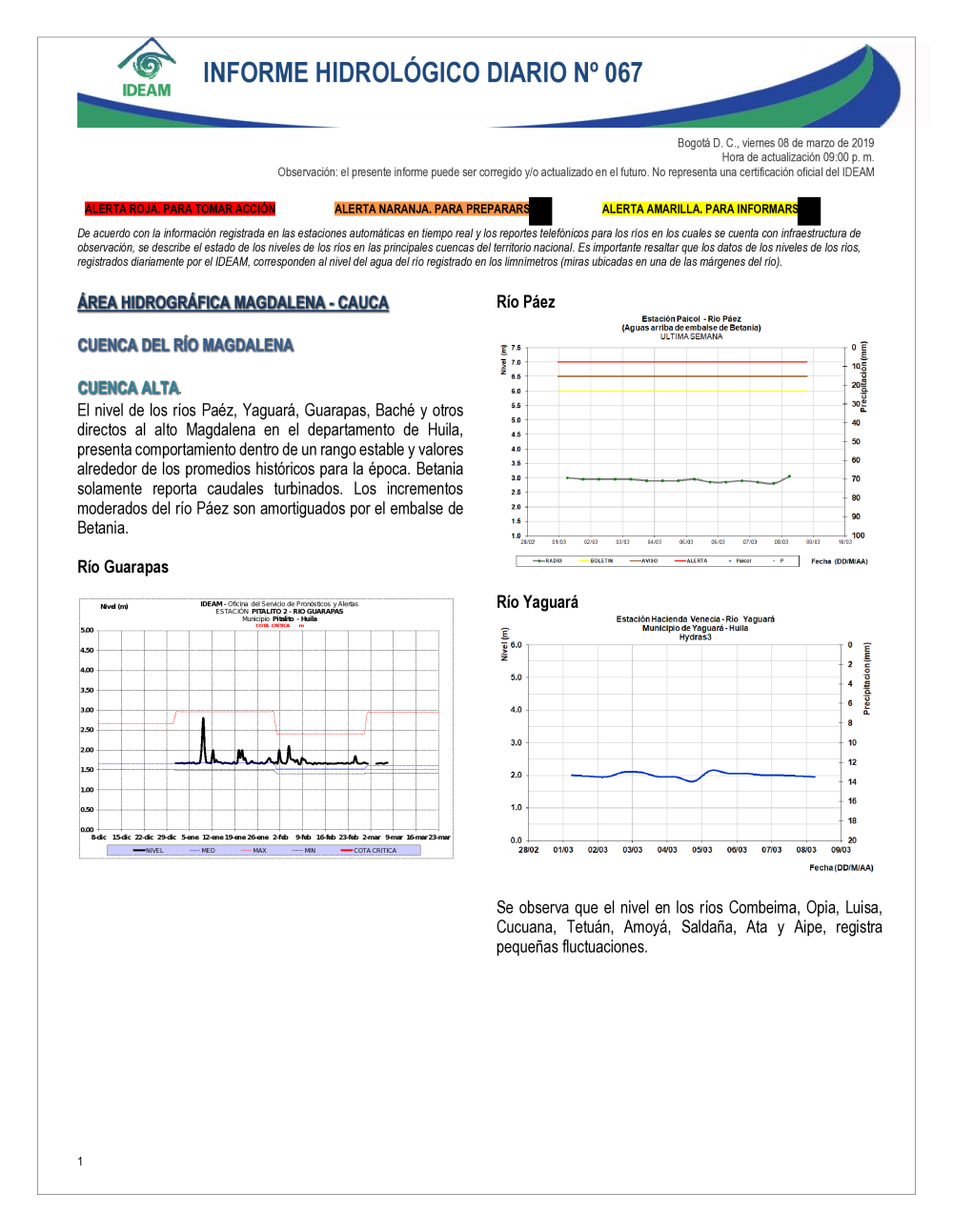 En general, el seguimiento que hace el Ideam del comportamiento hidrológico en los principales ríos del país se realiza con la información horaria en tiempo real que se recibe de las estaciones automáticas, complementadas con más de 40 estaciones hidrológicas que transmiten en las primeras horas cada mañana, los 365 días del año.