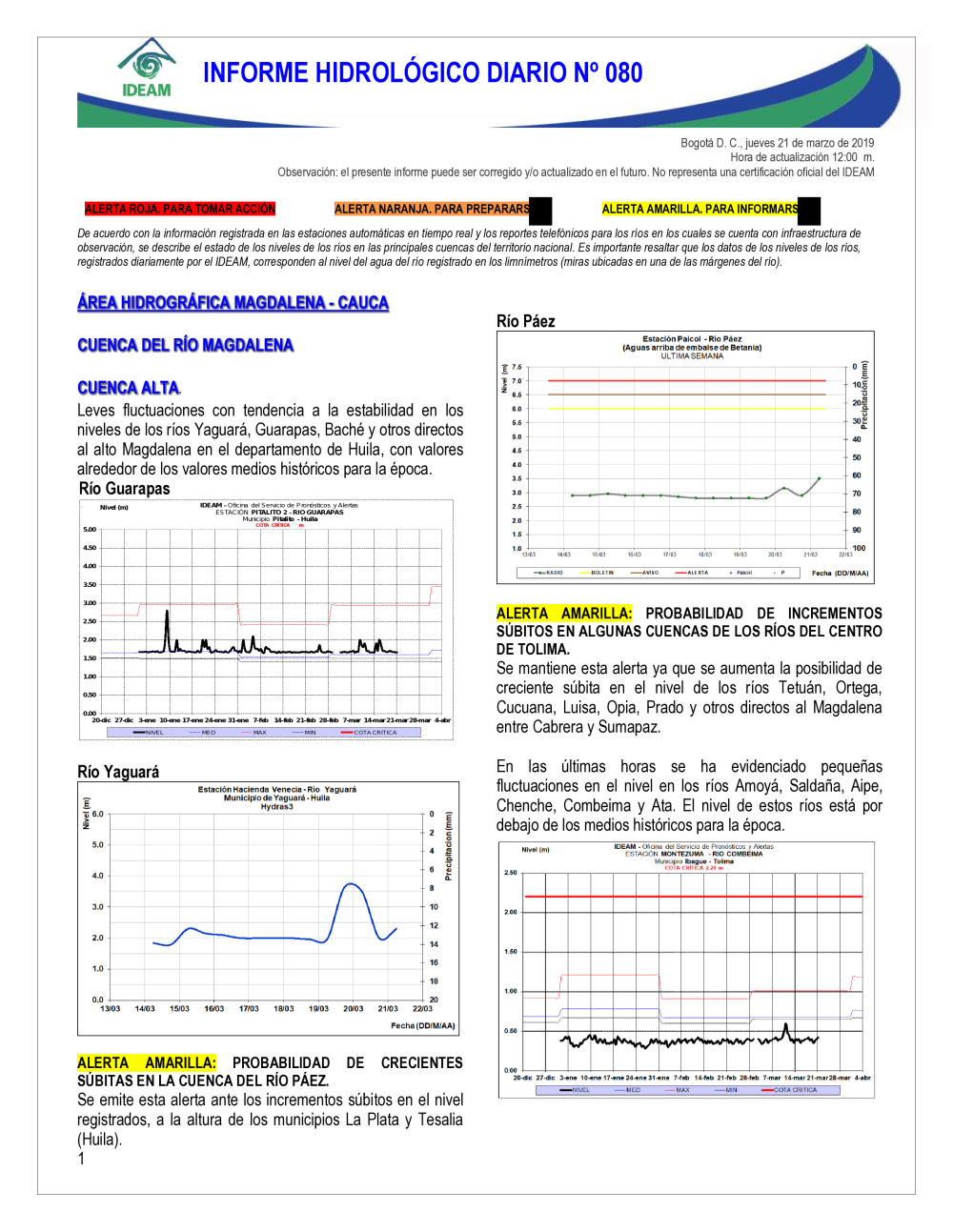 En general, el seguimiento que hace el Ideam del comportamiento hidrológico en los principales ríos del país se realiza con la información horaria en tiempo real que se recibe de las estaciones automáticas, complementadas con más de 40 estaciones hidrológicas que transmiten en las primeras horas cada mañana, los 365 días del año.