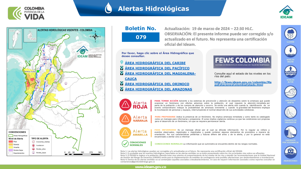Además, en las cinco vertientes hidrográficas del territorio colombiano el Ideam tiene 834 estaciones hidrológicas (389 limnimétricas y 445 limnigráficas) para suministrar datos sobre el régimen hidrológico de los cauces y cuerpos de agua principales, para hacer seguimiento al proceso de la escorrentía en el ciclo hidrológico y a los eventos extremos asociados. Algunos parámetros se observan dos veces al día, como el nivel del río y la concentración de sedimentos.