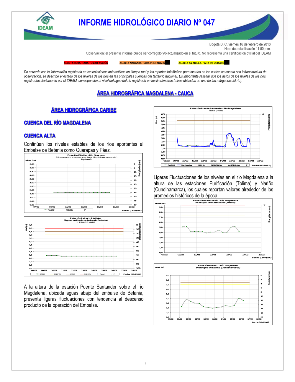 En general, el seguimiento que hace el Ideam del comportamiento hidrológico en los principales ríos del país se realiza con la información horaria en tiempo real que se recibe de las estaciones automáticas, complementadas con más de 40 estaciones hidrológicas que transmiten en las primeras horas cada mañana, los 365 días del año.