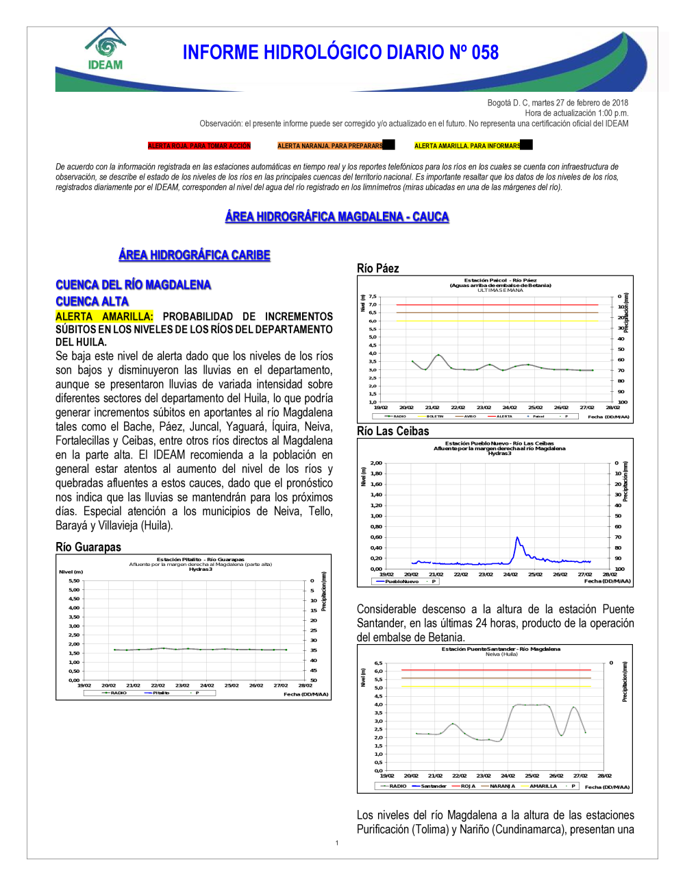 En general, el seguimiento que hace el Ideam del comportamiento hidrológico en los principales ríos del país se realiza con la información horaria en tiempo real que se recibe de las estaciones automáticas, complementadas con más de 40 estaciones hidrológicas que transmiten en las primeras horas cada mañana, los 365 días del año.