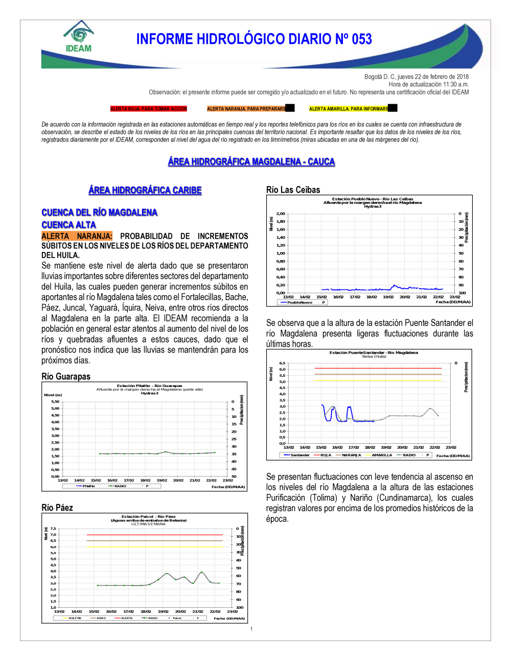 En general, el seguimiento que hace el Ideam del comportamiento hidrológico en los principales ríos del país se realiza con la información horaria en tiempo real que se recibe de las estaciones automáticas, complementadas con más de 40 estaciones hidrológicas que transmiten en las primeras horas cada mañana, los 365 días del año.