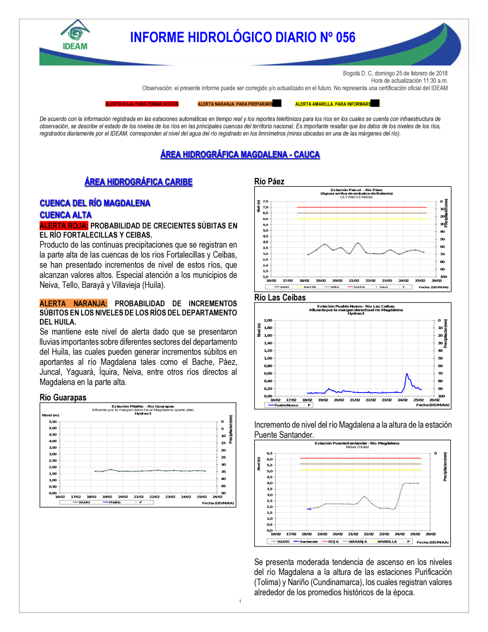 En general, el seguimiento que hace el Ideam del comportamiento hidrológico en los principales ríos del país se realiza con la información horaria en tiempo real que se recibe de las estaciones automáticas, complementadas con más de 40 estaciones hidrológicas que transmiten en las primeras horas cada mañana, los 365 días del año.