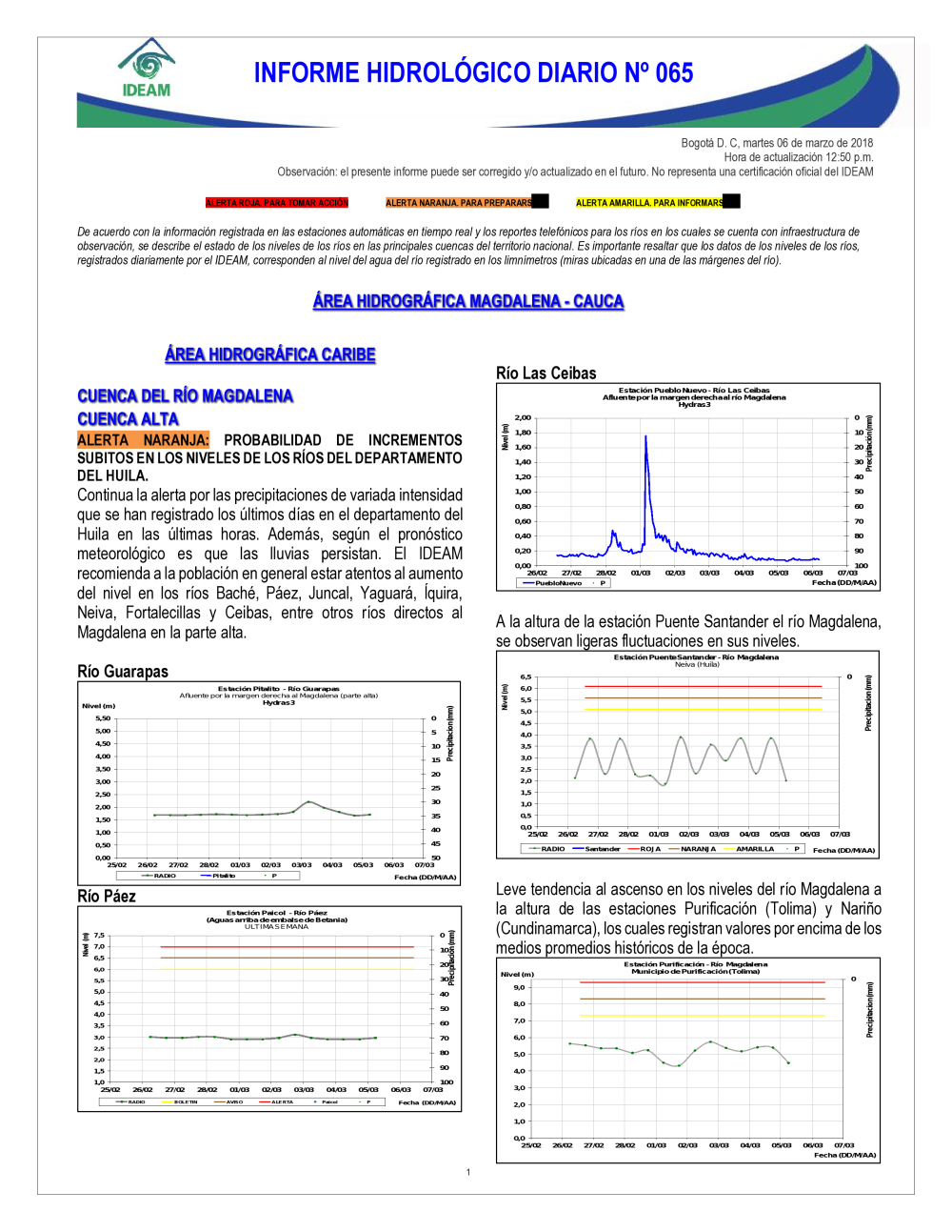 En general, el seguimiento que hace el Ideam del comportamiento hidrológico en los principales ríos del país se realiza con la información horaria en tiempo real que se recibe de las estaciones automáticas, complementadas con más de 40 estaciones hidrológicas que transmiten en las primeras horas cada mañana, los 365 días del año.
