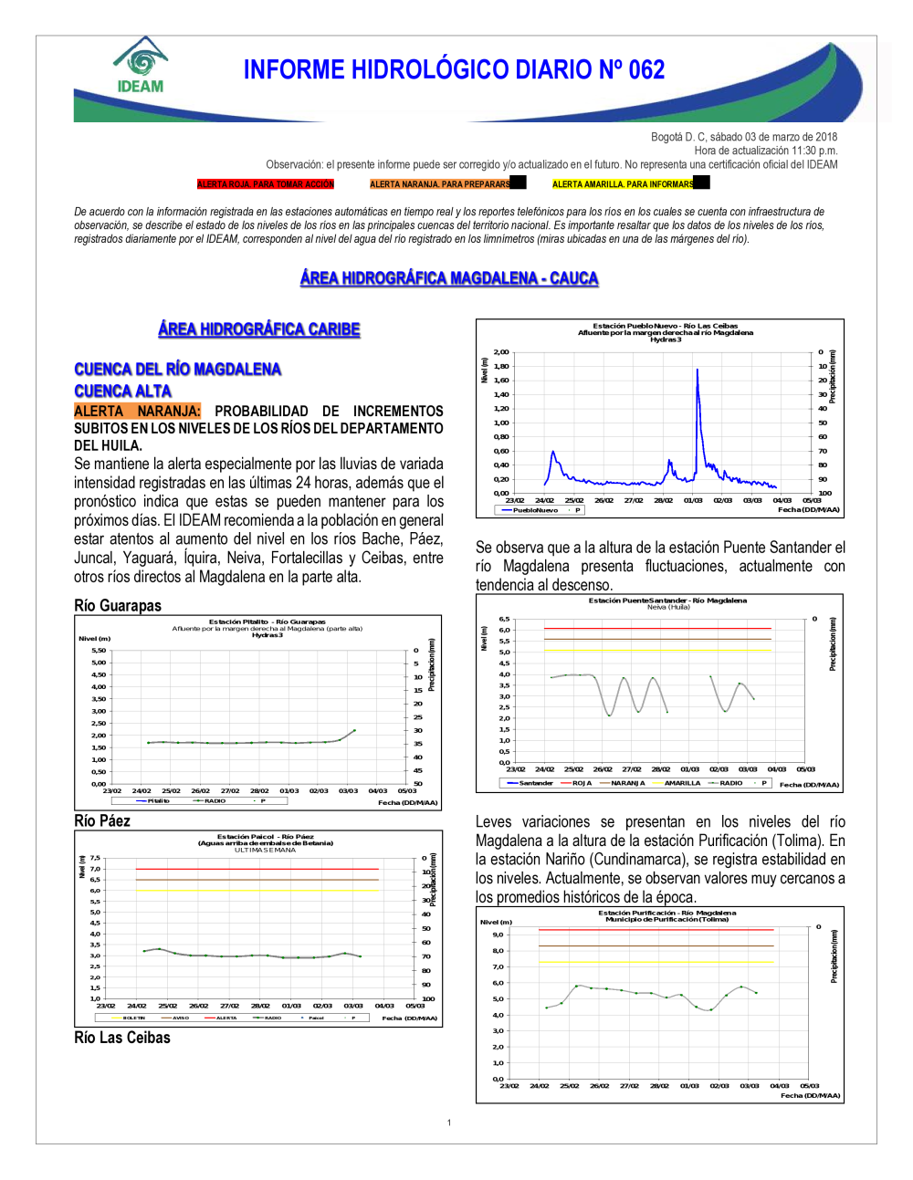 En general, el seguimiento que hace el Ideam del comportamiento hidrológico en los principales ríos del país se realiza con la información horaria en tiempo real que se recibe de las estaciones automáticas, complementadas con más de 40 estaciones hidrológicas que transmiten en las primeras horas cada mañana, los 365 días del año.