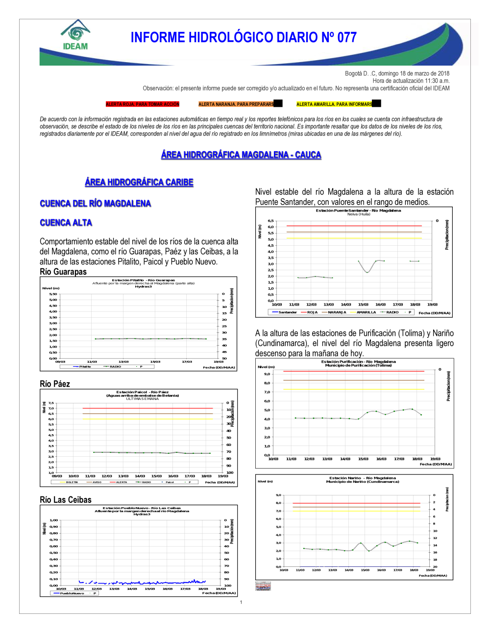 En general, el seguimiento que hace el Ideam del comportamiento hidrológico en los principales ríos del país se realiza con la información horaria en tiempo real que se recibe de las estaciones automáticas, complementadas con más de 40 estaciones hidrológicas que transmiten en las primeras horas cada mañana, los 365 días del año.