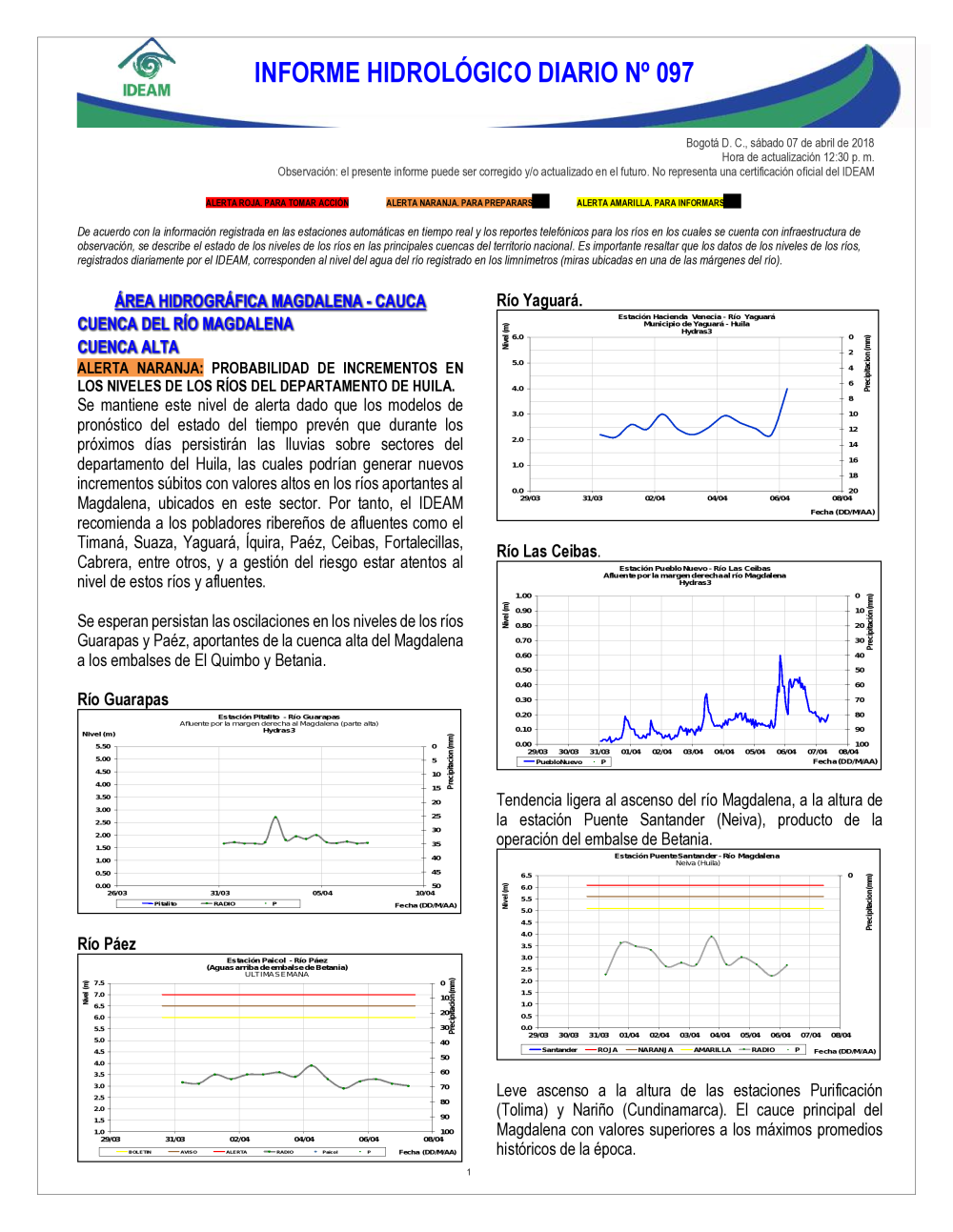 En general, el seguimiento que hace el Ideam del comportamiento hidrológico en los principales ríos del país se realiza con la información horaria en tiempo real que se recibe de las estaciones automáticas, complementadas con más de 40 estaciones hidrológicas que transmiten en las primeras horas cada mañana, los 365 días del año.