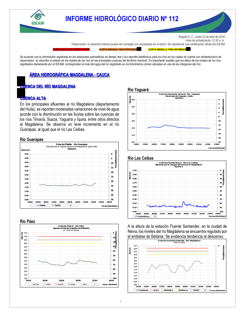 En general, el seguimiento que hace el Ideam del comportamiento hidrológico en los principales ríos del país se realiza con la información horaria en tiempo real que se recibe de las estaciones automáticas, complementadas con más de 40 estaciones hidrológicas que transmiten en las primeras horas cada mañana, los 365 días del año.