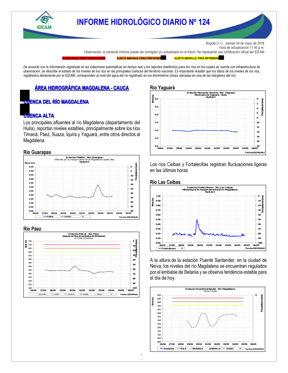 En general, el seguimiento que hace el Ideam del comportamiento hidrológico en los principales ríos del país se realiza con la información horaria en tiempo real que se recibe de las estaciones automáticas, complementadas con más de 40 estaciones hidrológicas que transmiten en las primeras horas cada mañana, los 365 días del año.