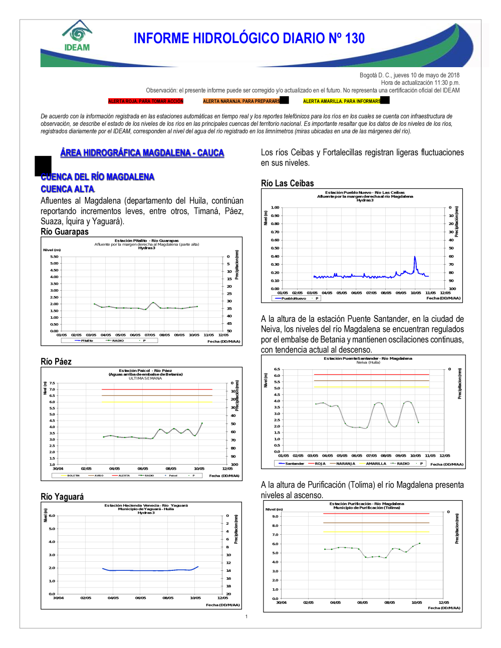 En general, el seguimiento que hace el Ideam del comportamiento hidrológico en los principales ríos del país se realiza con la información horaria en tiempo real que se recibe de las estaciones automáticas, complementadas con más de 40 estaciones hidrológicas que transmiten en las primeras horas cada mañana, los 365 días del año.
