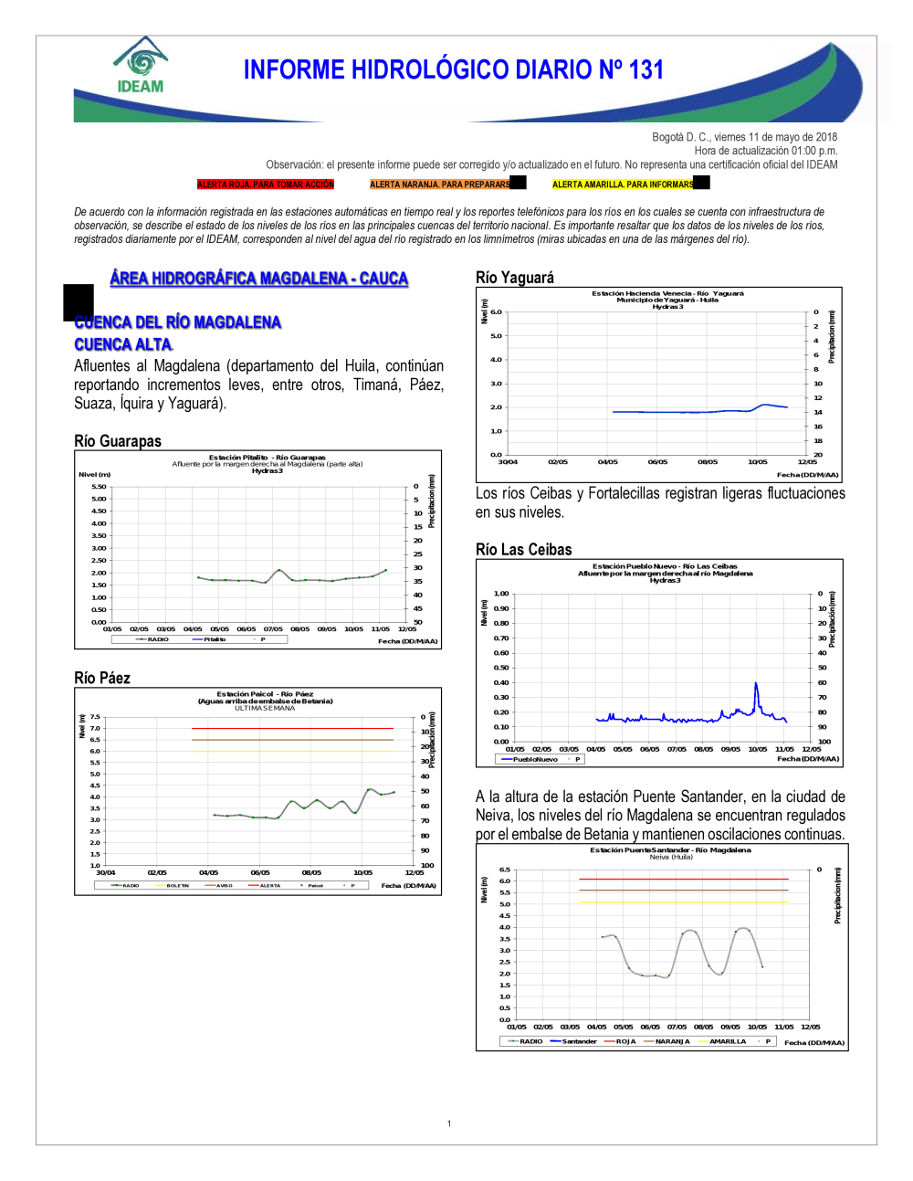 En general, el seguimiento que hace el Ideam del comportamiento hidrológico en los principales ríos del país se realiza con la información horaria en tiempo real que se recibe de las estaciones automáticas, complementadas con más de 40 estaciones hidrológicas que transmiten en las primeras horas cada mañana, los 365 días del año.