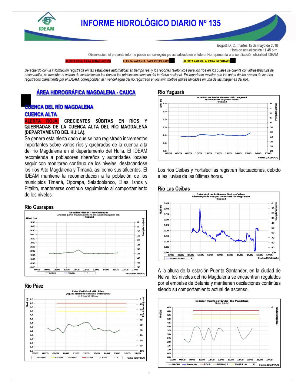 En general, el seguimiento que hace el Ideam del comportamiento hidrológico en los principales ríos del país se realiza con la información horaria en tiempo real que se recibe de las estaciones automáticas, complementadas con más de 40 estaciones hidrológicas que transmiten en las primeras horas cada mañana, los 365 días del año.