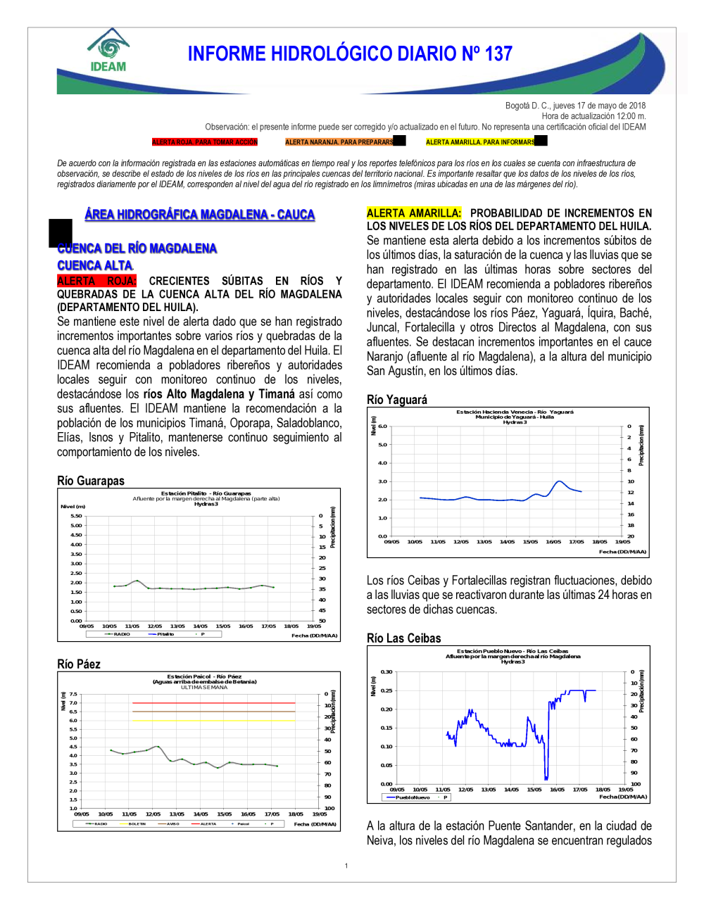 En general, el seguimiento que hace el Ideam del comportamiento hidrológico en los principales ríos del país se realiza con la información horaria en tiempo real que se recibe de las estaciones automáticas, complementadas con más de 40 estaciones hidrológicas que transmiten en las primeras horas cada mañana, los 365 días del año.