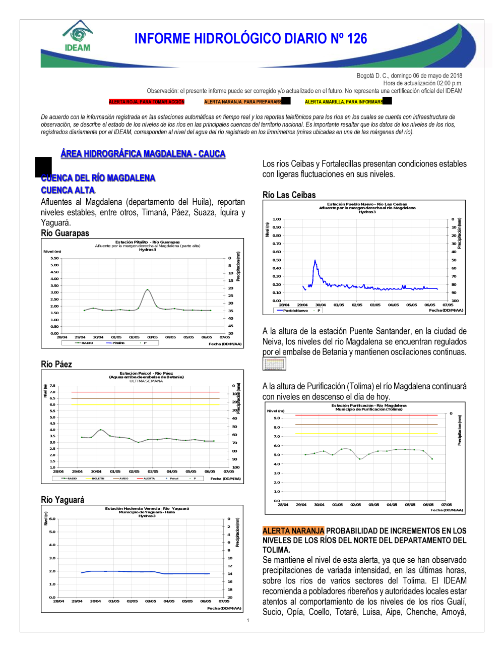 En general, el seguimiento que hace el Ideam del comportamiento hidrológico en los principales ríos del país se realiza con la información horaria en tiempo real que se recibe de las estaciones automáticas, complementadas con más de 40 estaciones hidrológicas que transmiten en las primeras horas cada mañana, los 365 días del año.