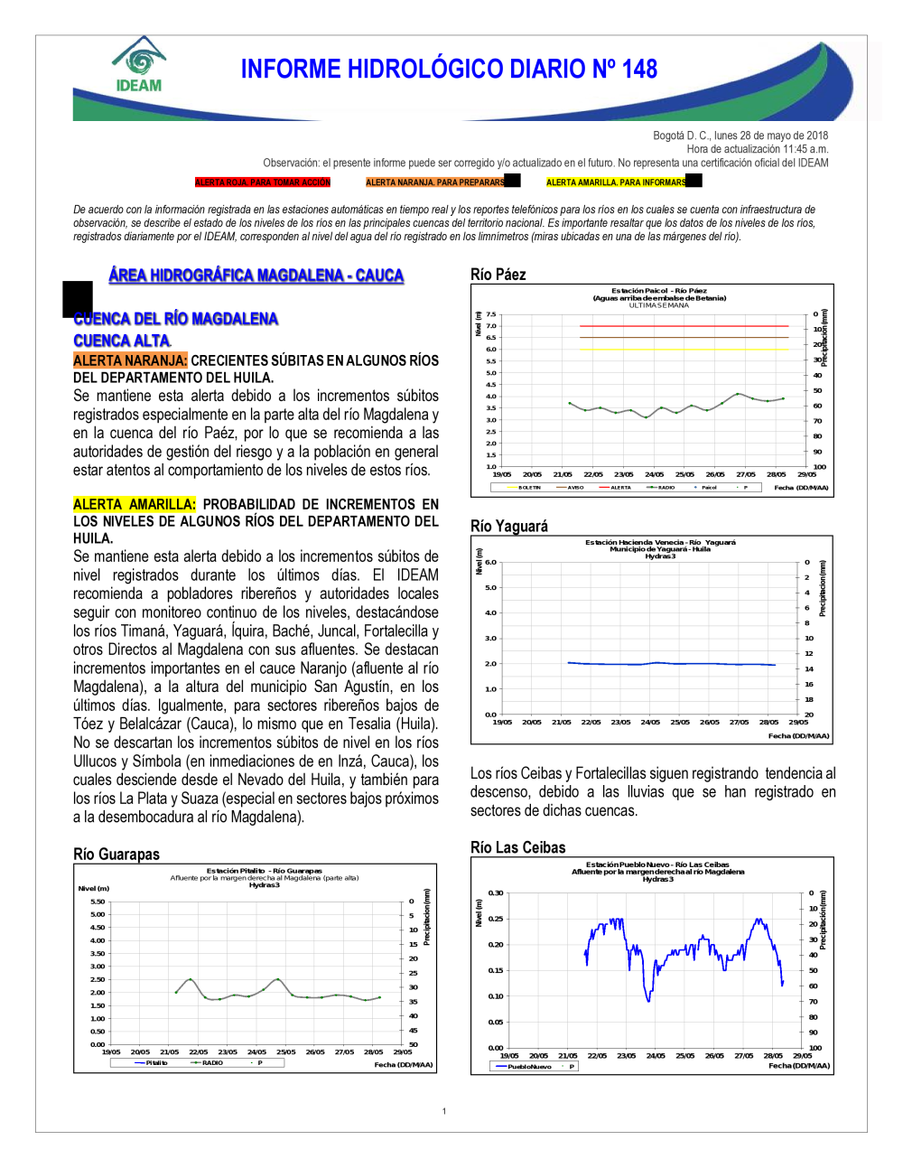 En general, el seguimiento que hace el Ideam del comportamiento hidrológico en los principales ríos del país se realiza con la información horaria en tiempo real que se recibe de las estaciones automáticas, complementadas con más de 40 estaciones hidrológicas que transmiten en las primeras horas cada mañana, los 365 días del año.