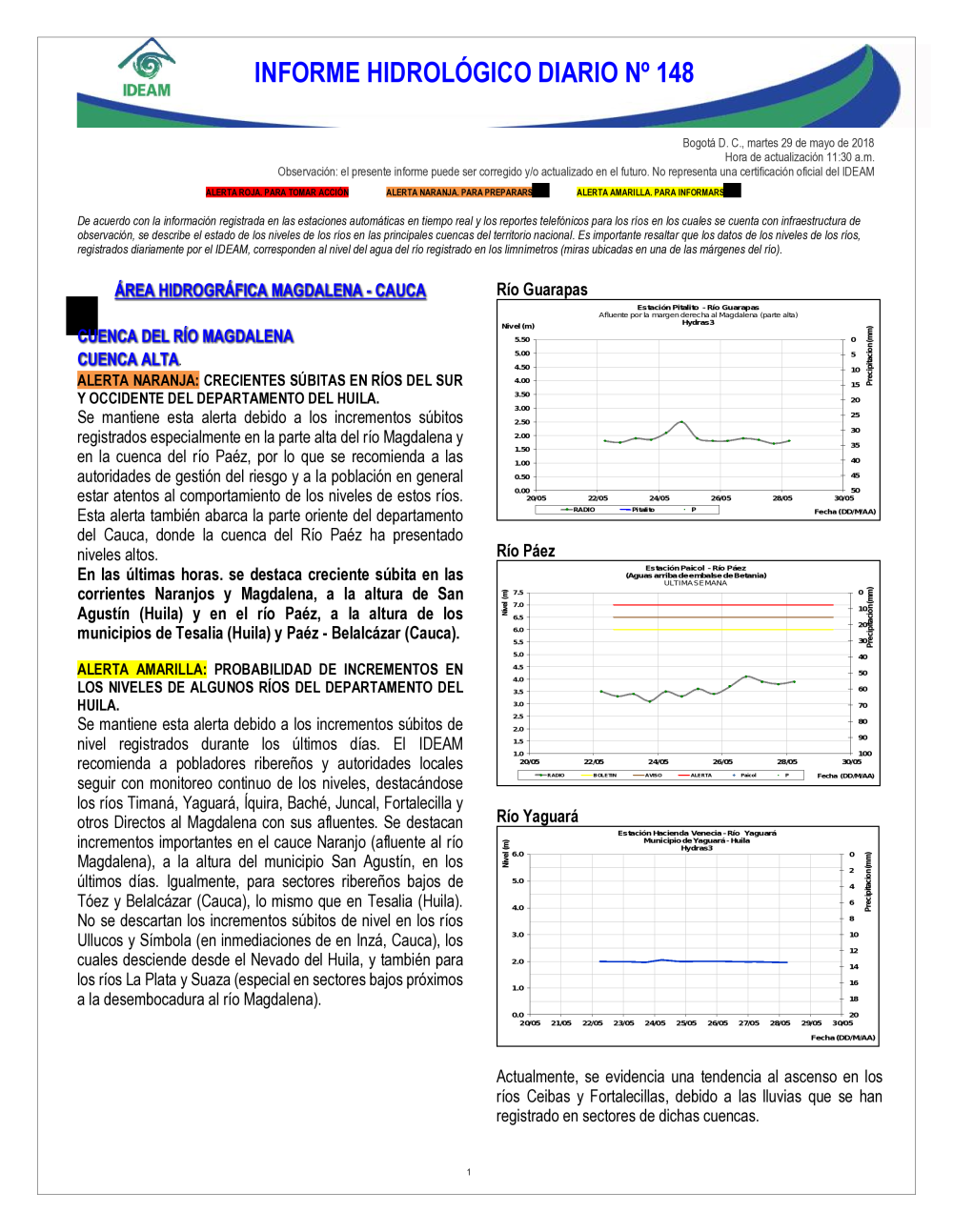 En general, el seguimiento que hace el Ideam del comportamiento hidrológico en los principales ríos del país se realiza con la información horaria en tiempo real que se recibe de las estaciones automáticas, complementadas con más de 40 estaciones hidrológicas que transmiten en las primeras horas cada mañana, los 365 días del año.