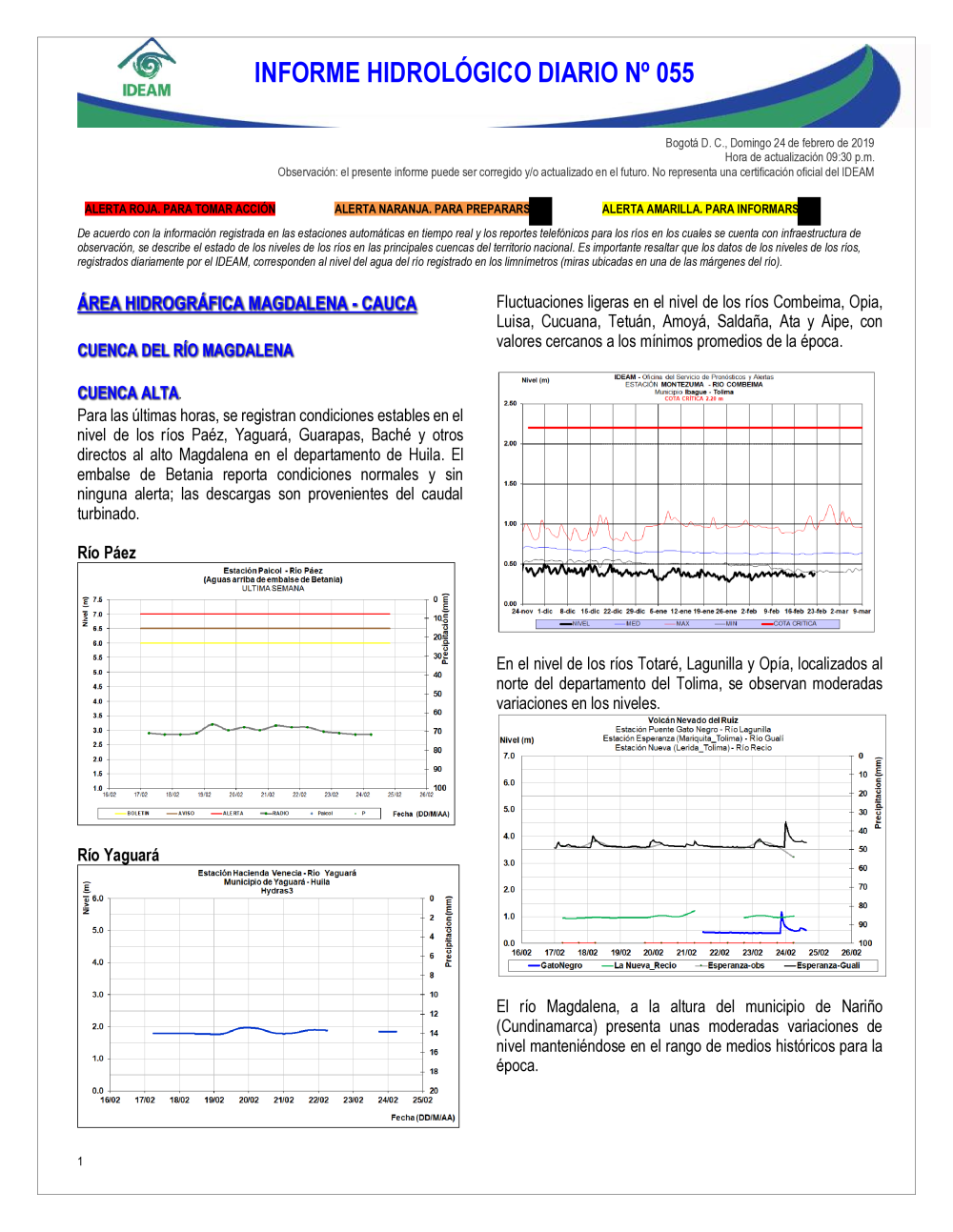En general, el seguimiento que hace el Ideam del comportamiento hidrológico en los principales ríos del país se realiza con la información horaria en tiempo real que se recibe de las estaciones automáticas, complementadas con más de 40 estaciones hidrológicas que transmiten en las primeras horas cada mañana, los 365 días del año.
