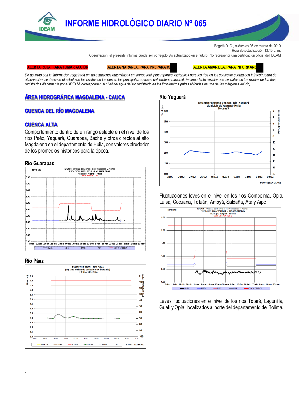 En general, el seguimiento que hace el Ideam del comportamiento hidrológico en los principales ríos del país se realiza con la información horaria en tiempo real que se recibe de las estaciones automáticas, complementadas con más de 40 estaciones hidrológicas que transmiten en las primeras horas cada mañana, los 365 días del año.