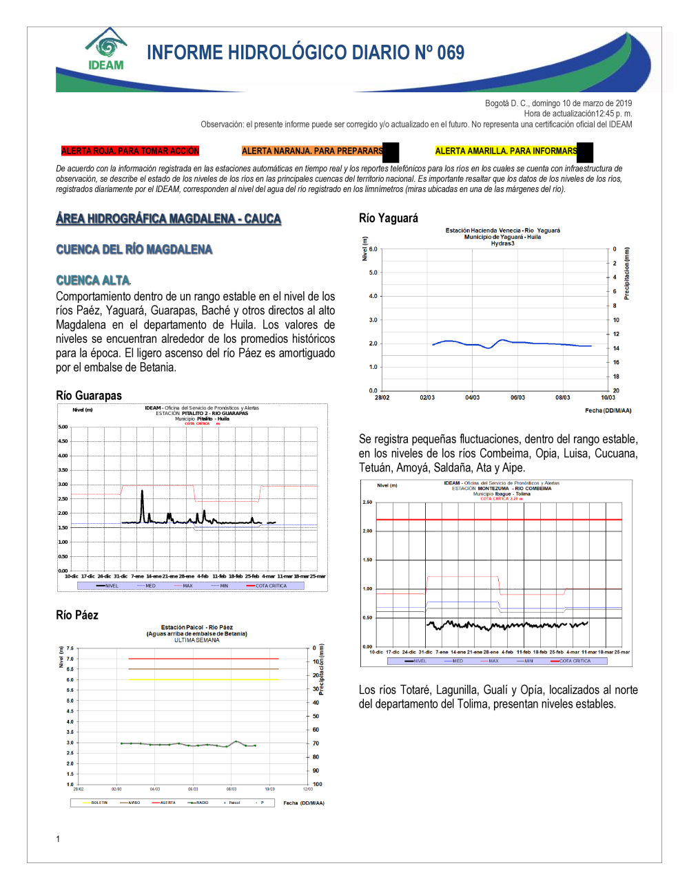 En general, el seguimiento que hace el Ideam del comportamiento hidrológico en los principales ríos del país se realiza con la información horaria en tiempo real que se recibe de las estaciones automáticas, complementadas con más de 40 estaciones hidrológicas que transmiten en las primeras horas cada mañana, los 365 días del año.