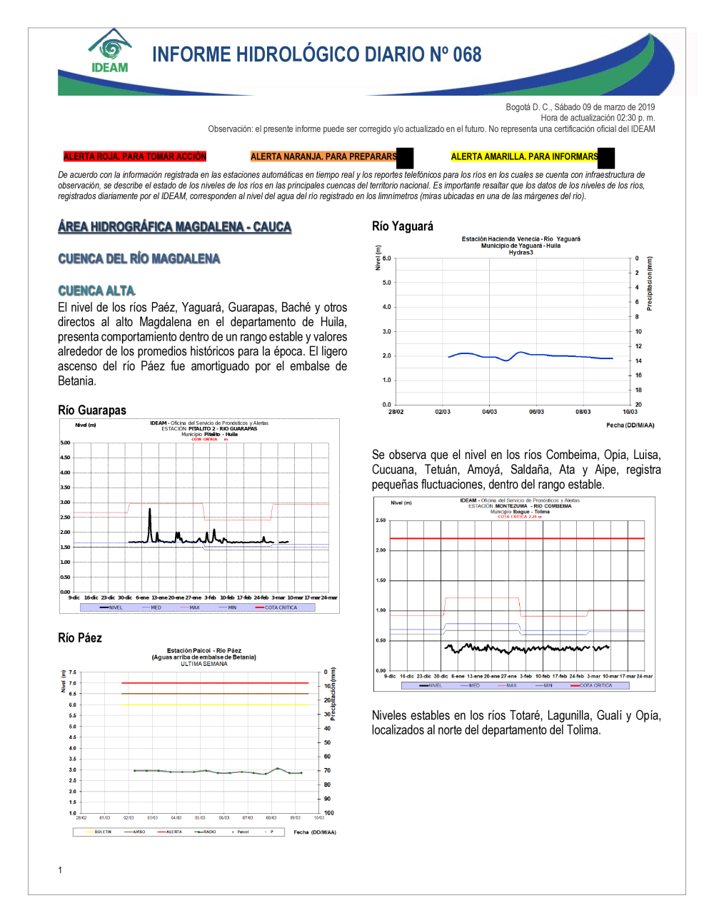 En general, el seguimiento que hace el Ideam del comportamiento hidrológico en los principales ríos del país se realiza con la información horaria en tiempo real que se recibe de las estaciones automáticas, complementadas con más de 40 estaciones hidrológicas que transmiten en las primeras horas cada mañana, los 365 días del año.