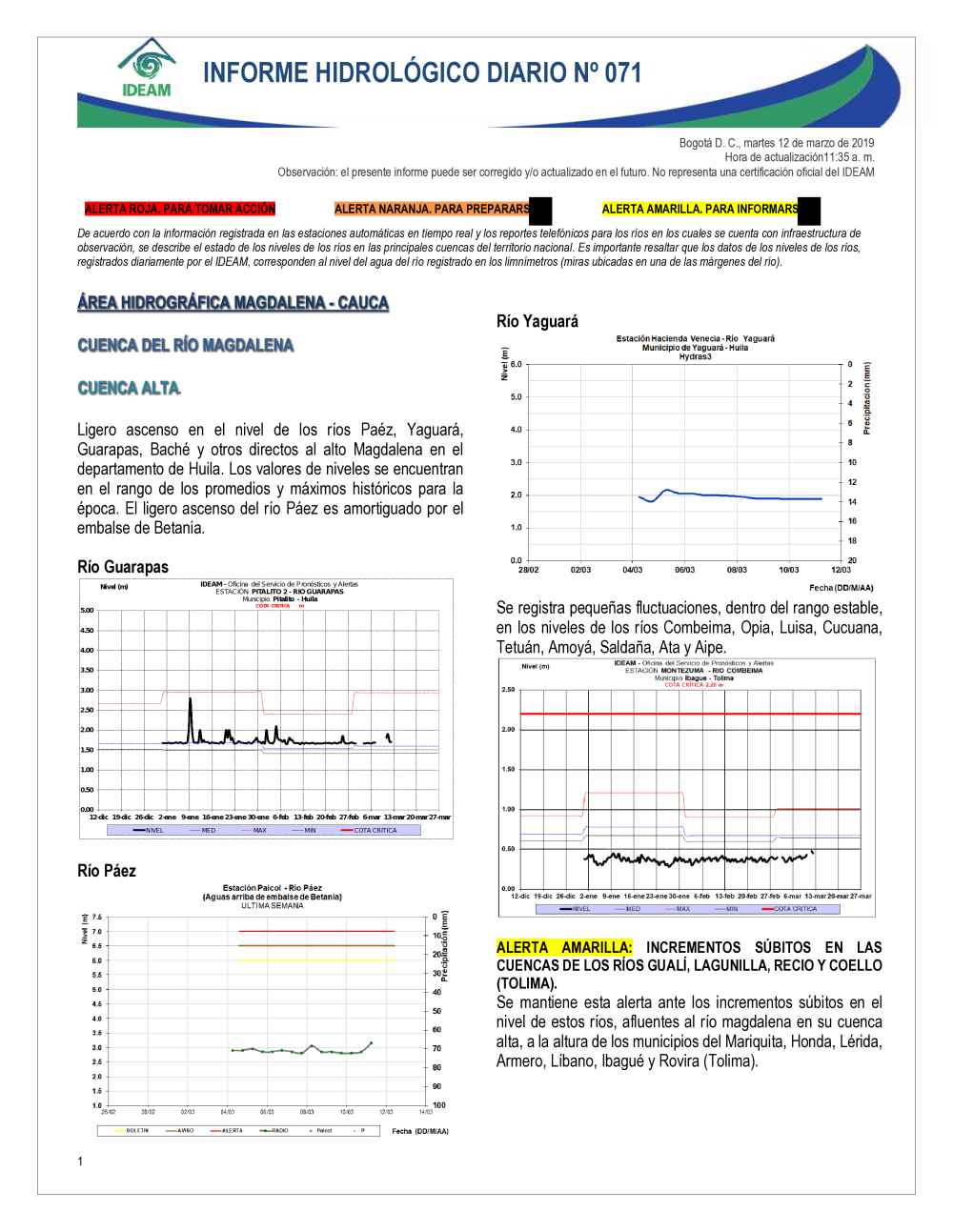 En general, el seguimiento que hace el Ideam del comportamiento hidrológico en los principales ríos del país se realiza con la información horaria en tiempo real que se recibe de las estaciones automáticas, complementadas con más de 40 estaciones hidrológicas que transmiten en las primeras horas cada mañana, los 365 días del año.