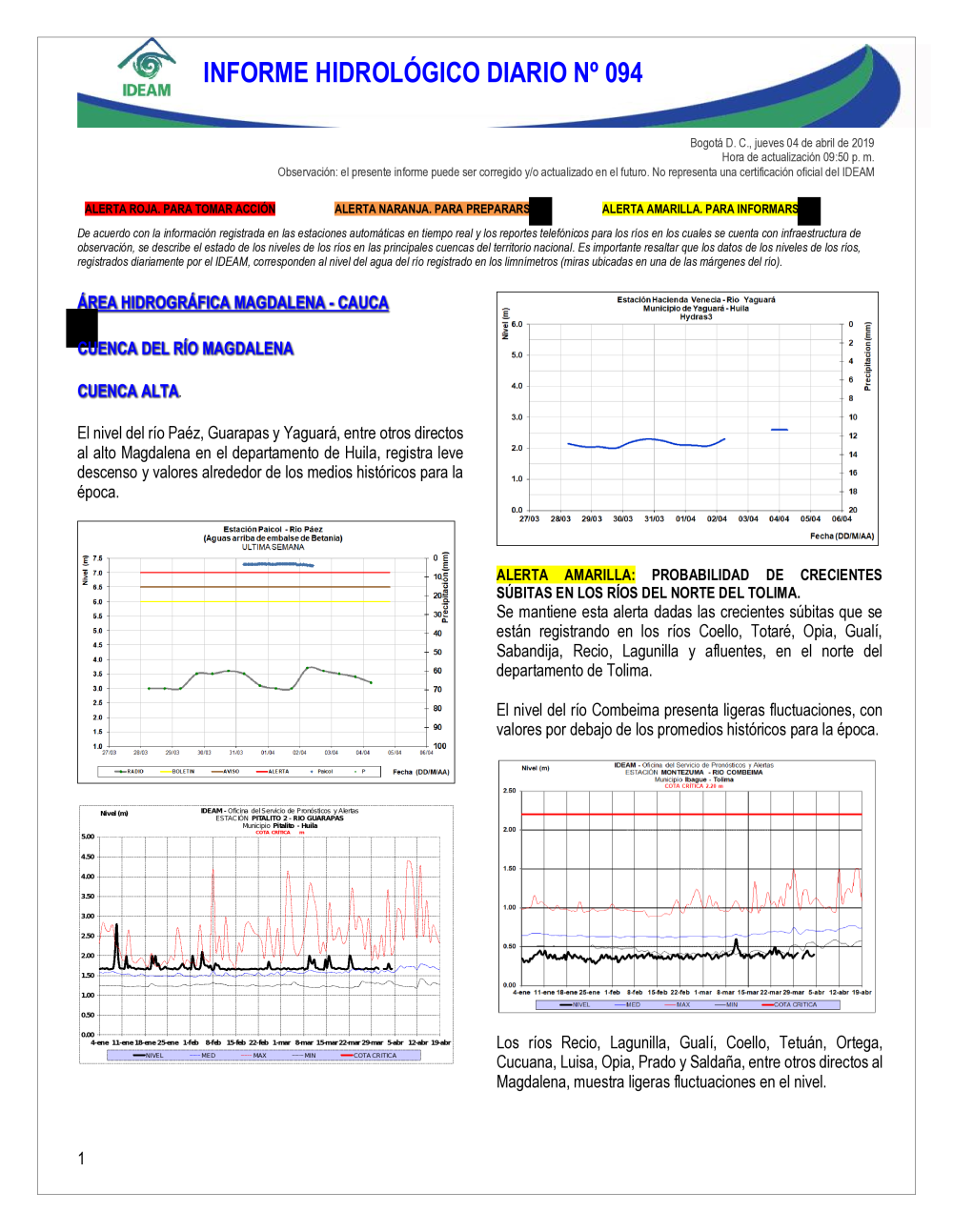 En general, el seguimiento que hace el Ideam del comportamiento hidrológico en los principales ríos del país se realiza con la información horaria en tiempo real que se recibe de las estaciones automáticas, complementadas con más de 40 estaciones hidrológicas que transmiten en las primeras horas cada mañana, los 365 días del año.
