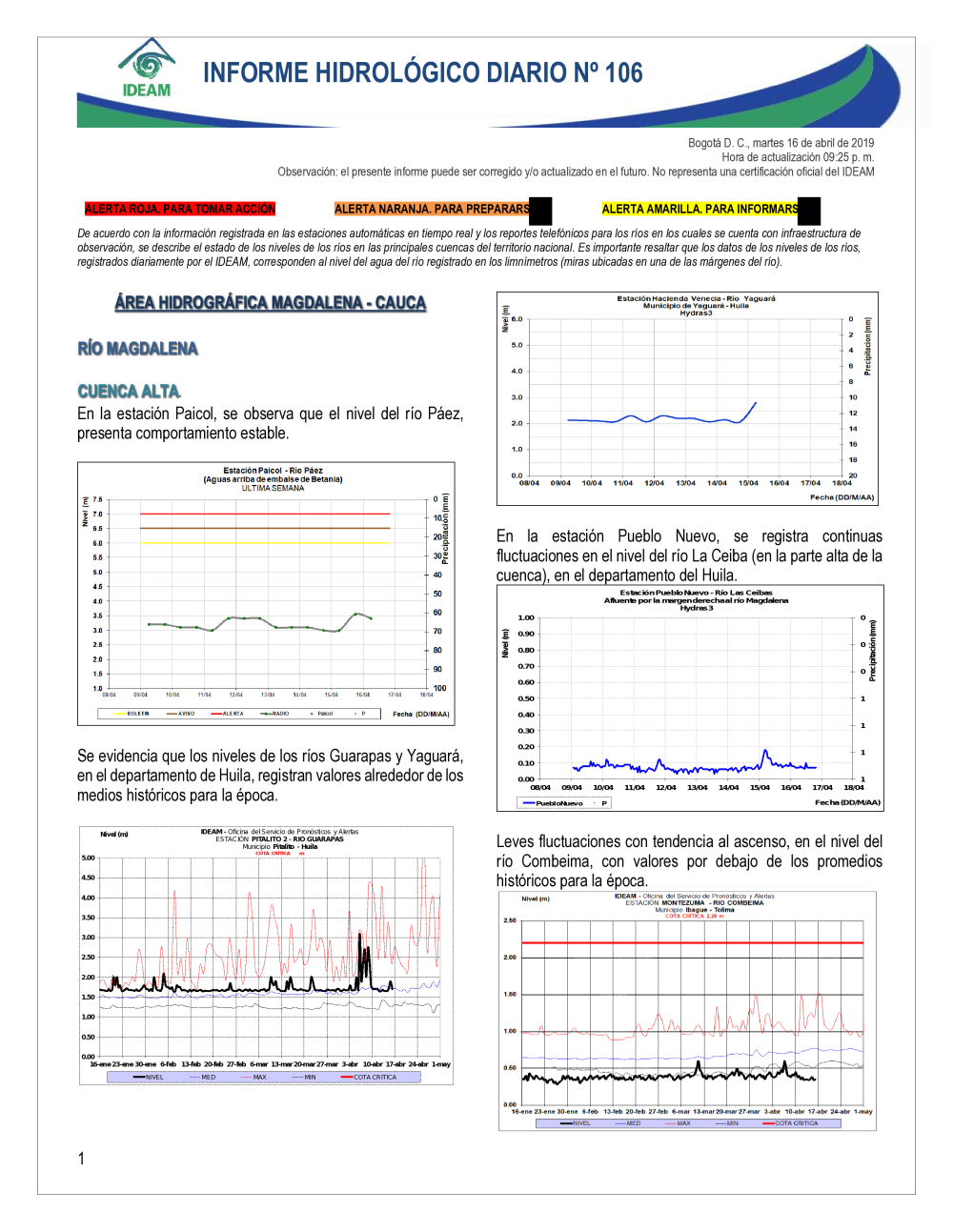En general, el seguimiento que hace el Ideam del comportamiento hidrológico en los principales ríos del país se realiza con la información horaria en tiempo real que se recibe de las estaciones automáticas, complementadas con más de 40 estaciones hidrológicas que transmiten en las primeras horas cada mañana, los 365 días del año.