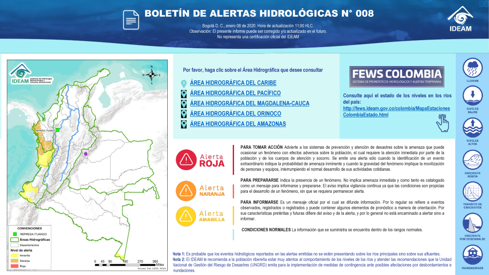 En general, el seguimiento que hace el Ideam del comportamiento hidrológico en los principales ríos del país se realiza con la información horaria en tiempo real que se recibe de las estaciones automáticas, complementadas con más de 40 estaciones hidrológicas que transmiten en las primeras horas cada mañana, los 365 días del año.